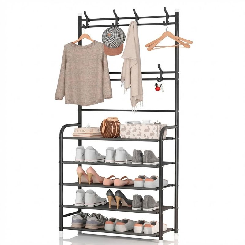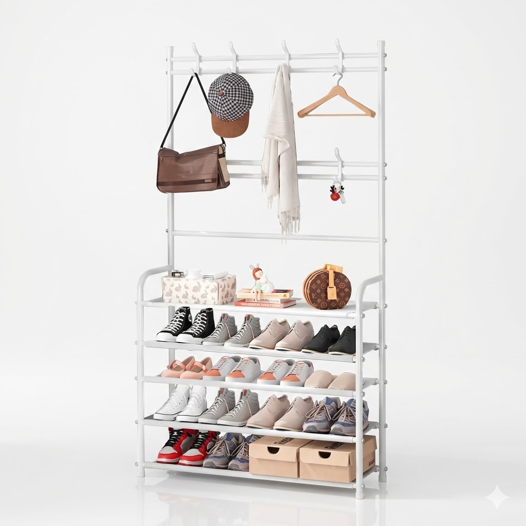 El desorden visual genera estrés y te quita espacio útil. Nuestro Perchero Zapatero de 5 Niveles concentra todo tu calzado, bolsos y abrigos en un solo lugar vertical, dándote la bienvenida tranquila y ordenada que te merecés.