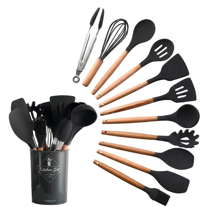 Ahorrás $200El Set de 12 Piezas de Silicona Rígida y Madera que no raya el teflón, no se derrite con el calor y se ve increíble en tu mesada.